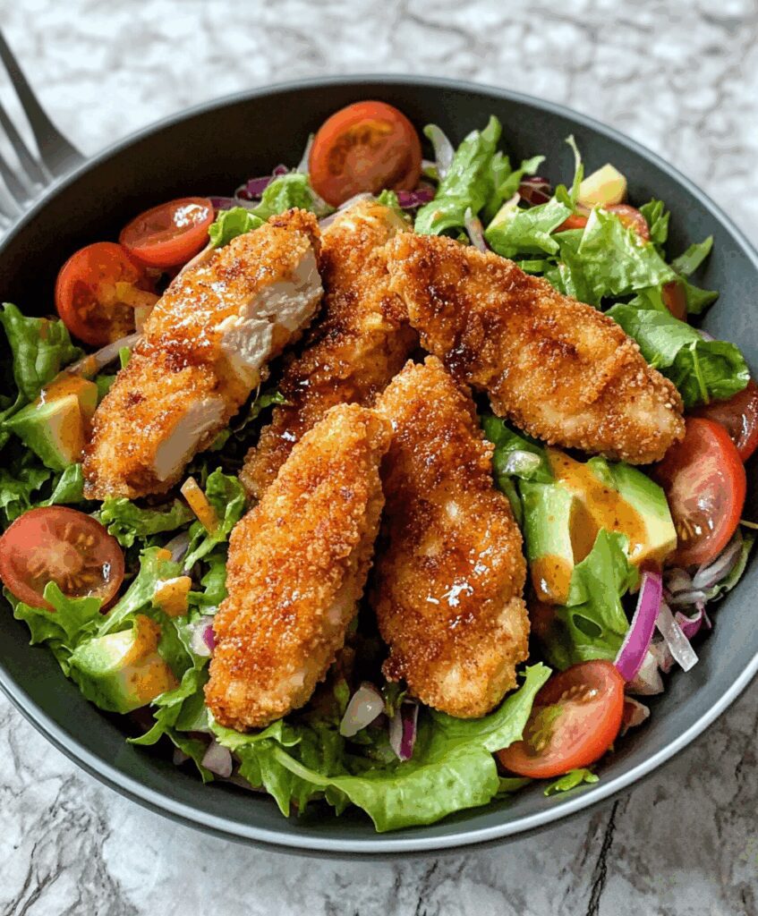 It’s quick, satisfying, and way healthier than fast food versions—thanks to the magic of the air fryer! You get all the comfort and crunch of fried chicken tenders without the grease, and paired with fresh veggies and a zesty homemade dressing, this becomes a salad you’ll actually crave.