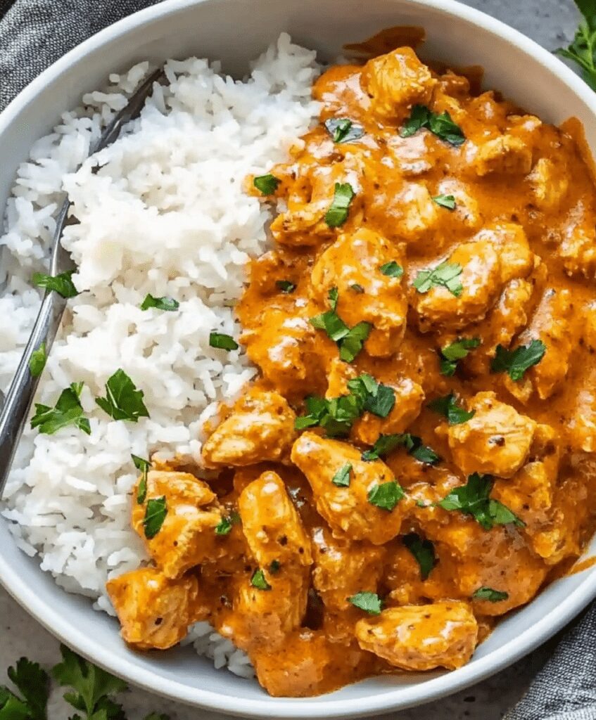 - Bring to a simmer and cook for 8–10 minutes, stirring occasionally, until the chicken is cooked through and the sauce thickens slightly.