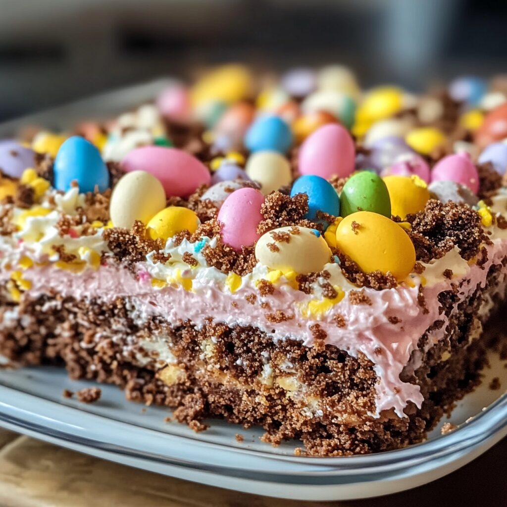 Topped with chocolate cookie “dirt,” pastel sprinkles, and adorable candy eggs, this Easter-themed dirt cake is the ultimate spring dessert. Plus, it’s make-ahead friendly—perfect for Easter brunch, potlucks, or family gatherings!