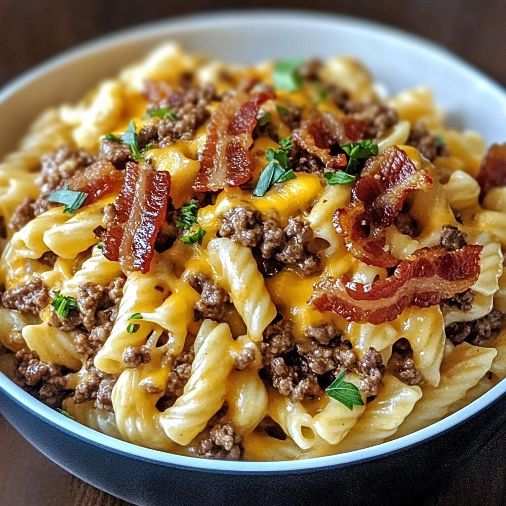 Get ready for tender pasta coated in a creamy, cheesy, beefy sauce, studded with crispy bacon, melty cheddar, and a touch of burger-style ketchup-mustard tang. It’s rich, hearty, and wildly addictive.