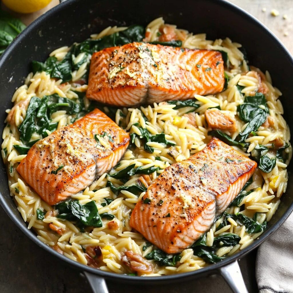 Nestle the cooked salmon back on top of the lemon orzo. Garnish with extra herbs, lemon wedges, or cracked pepper. Serve warm straight from the skillet.
