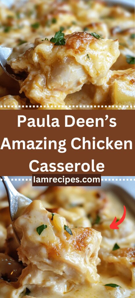 This hearty and creamy chicken casserole, inspired by Paula Deen, combines tender chicken, pasta, and a rich cheese sauce, making it a comforting dish perfect for family dinners.