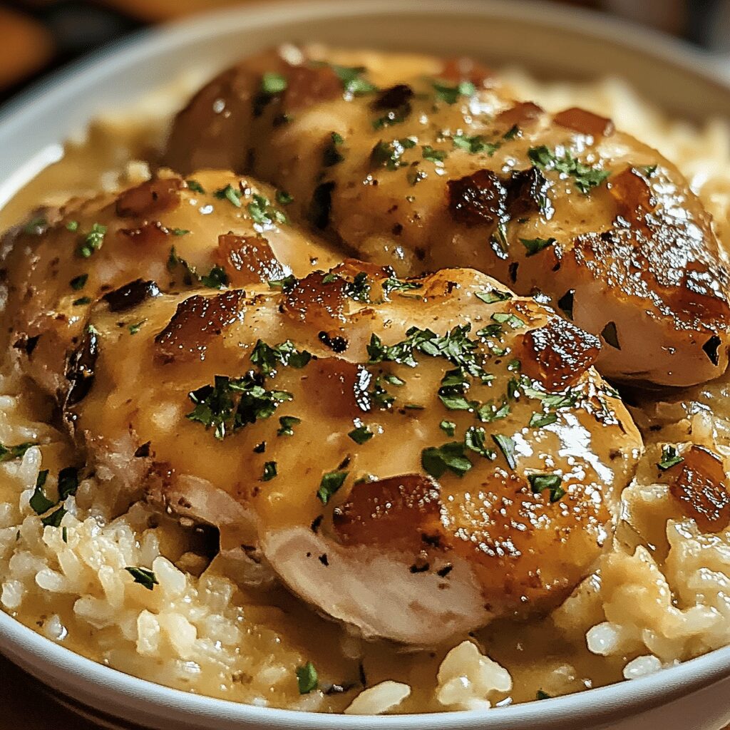 - Serve the chicken over cooked rice, smothered in the creamy gravy.