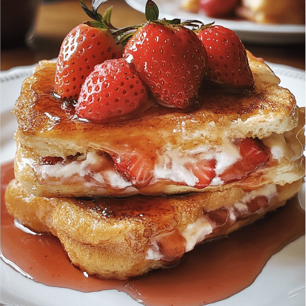 Picture this: thick slices of buttery brioche bread filled with a sweet, tangy cream cheese mixture, fresh strawberries layered inside, all dipped in cinnamon-vanilla egg custard and pan-fried to golden perfection. Topped with powdered sugar, syrup, or even whipped cream—every bite is rich, warm, and indulgent.