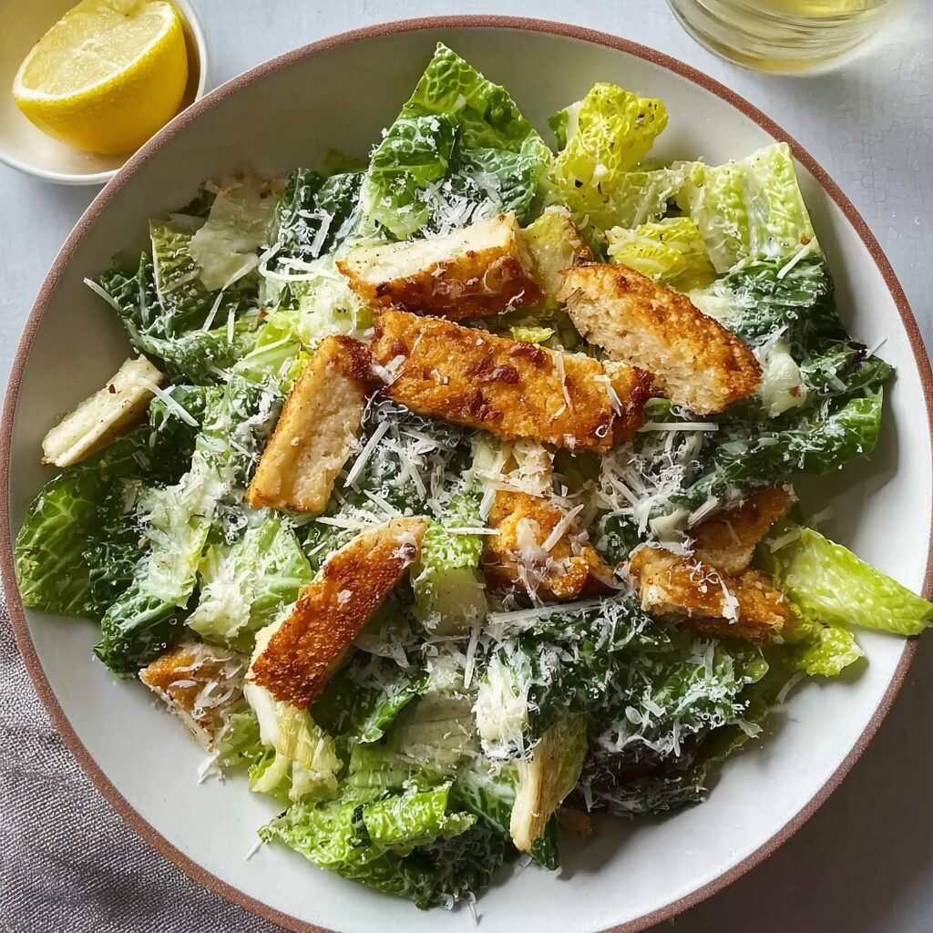 A fresh and flavorful twist on the classic Caesar salad, this vegetarian version swaps anchovies for a rich, savory dressing made with Parmesan, garlic, and tangy lemon. Crisp romaine, crunchy croutons, and a creamy dressing come together to create a satisfying salad that’s perfect as a starter or light meal.